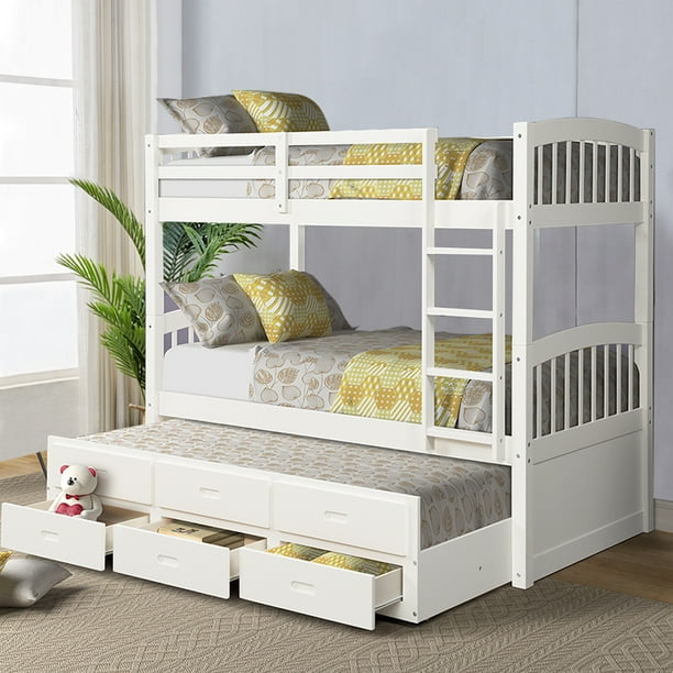 Meets the latest consumer product safety standards; Need more than two beds in one room? The staircase allows for easy access to the top bunk and the drawers provide additional storage space. This twin over twin solid wood bunk bed brings style, affordability, and flexibility for families. Floor twin over full bunk bed with stair and guard rail, wood bunk bed with twin size trundle, twin over full size kid's bunk bed in white.